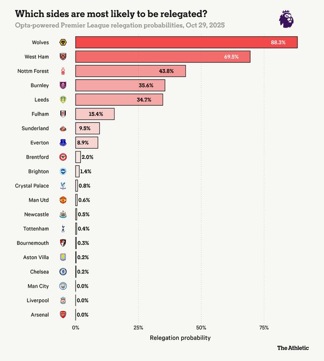 利兹联的三场胜利都是对阵目前排名倒数七名的球队,但他们的潜在数据提供了很多乐观的理由。他们在平均预期进球差(xG difference)中排名第六,这反映了他们持续强劲的表现,即使结果并不总是随之而来。如果他们保持这种水平,他们有很大机会保级成功。